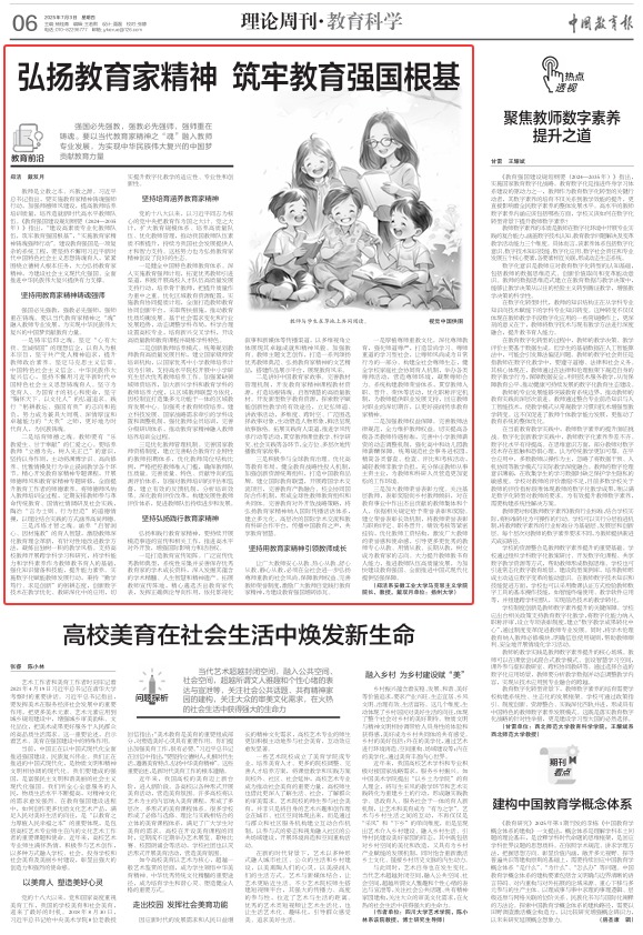 我校马克思主义学院郑洁教授在《中国教育报》2025年7月3日第6版,以“弘扬教育家精神 筑牢教育强国根基”为题,发表理论阐释文章。全文如下:强国必先强教,强教必先强师,强师重在铸魂。要以当代教育家精神之“魂”融入教师专业发展,为实现中华民族伟大...