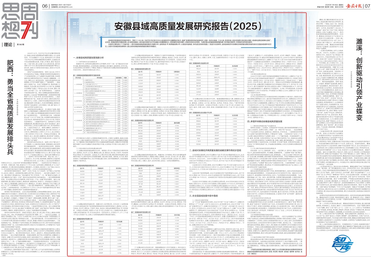 我校商学院洪功翔教授智库团队在《安徽日报》2025年7月18日第6-7版,发表了题为“安徽县域高质量发展研究报告(2025)”的研究报告。本报告由安徽日报智库联盟、安徽工业大学安徽创新驱动发展研究院和安徽省区域发展研究会联合发布,洪功翔、周世军、武优...
