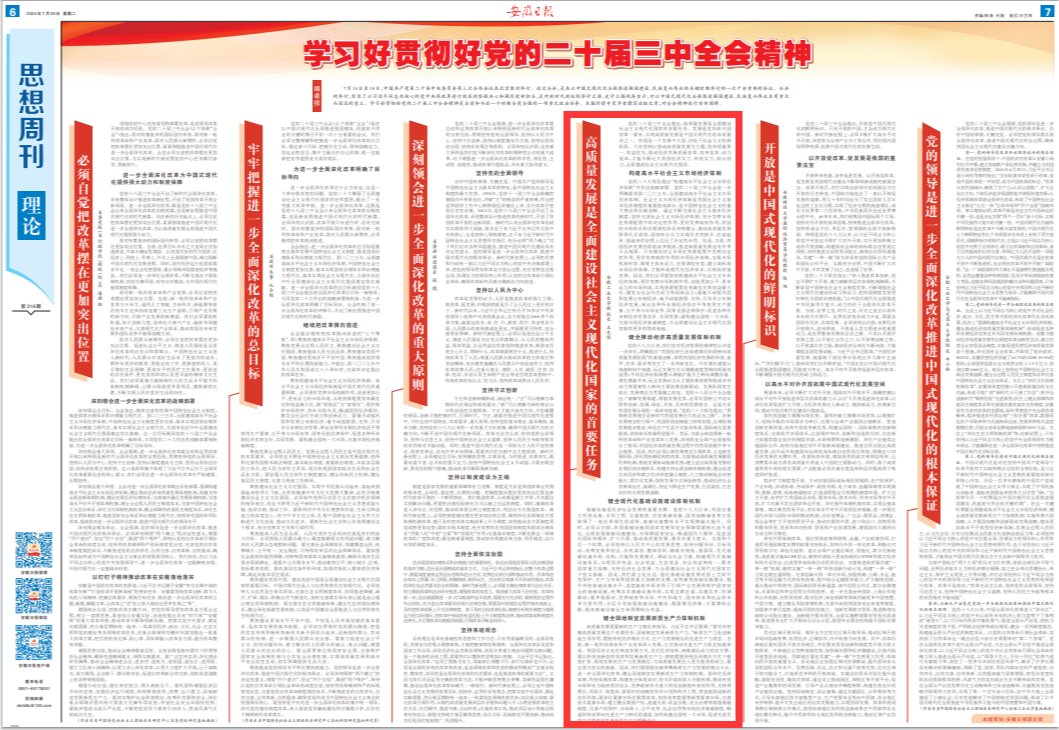 7月15日至18日,中国共产党第二十届中央委员会第三次全体会议在北京胜利举行。学习好贯彻好党的二十届三中全会精神是当前和今后一个时期全党全国的一项重大政治任务。《安徽日报》约请专家学者对全会精神进行宣传阐释。我校王先柱教授以《高质量发展是全面...